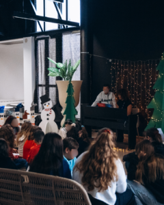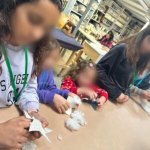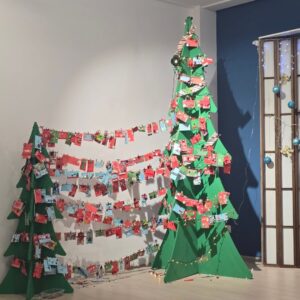 Όλα τα παιδιά δημιούργησαν τη δική τους χριστουγεννιάτικη κάρτα — περισσότερες από 500 κάρτες συνολικά — οι οποίες στόλισαν το ξύλινο χριστουγεννιάτικο δέντρο του χώρου, μετατρέποντάς το σε ένα συλλογικό έργο.